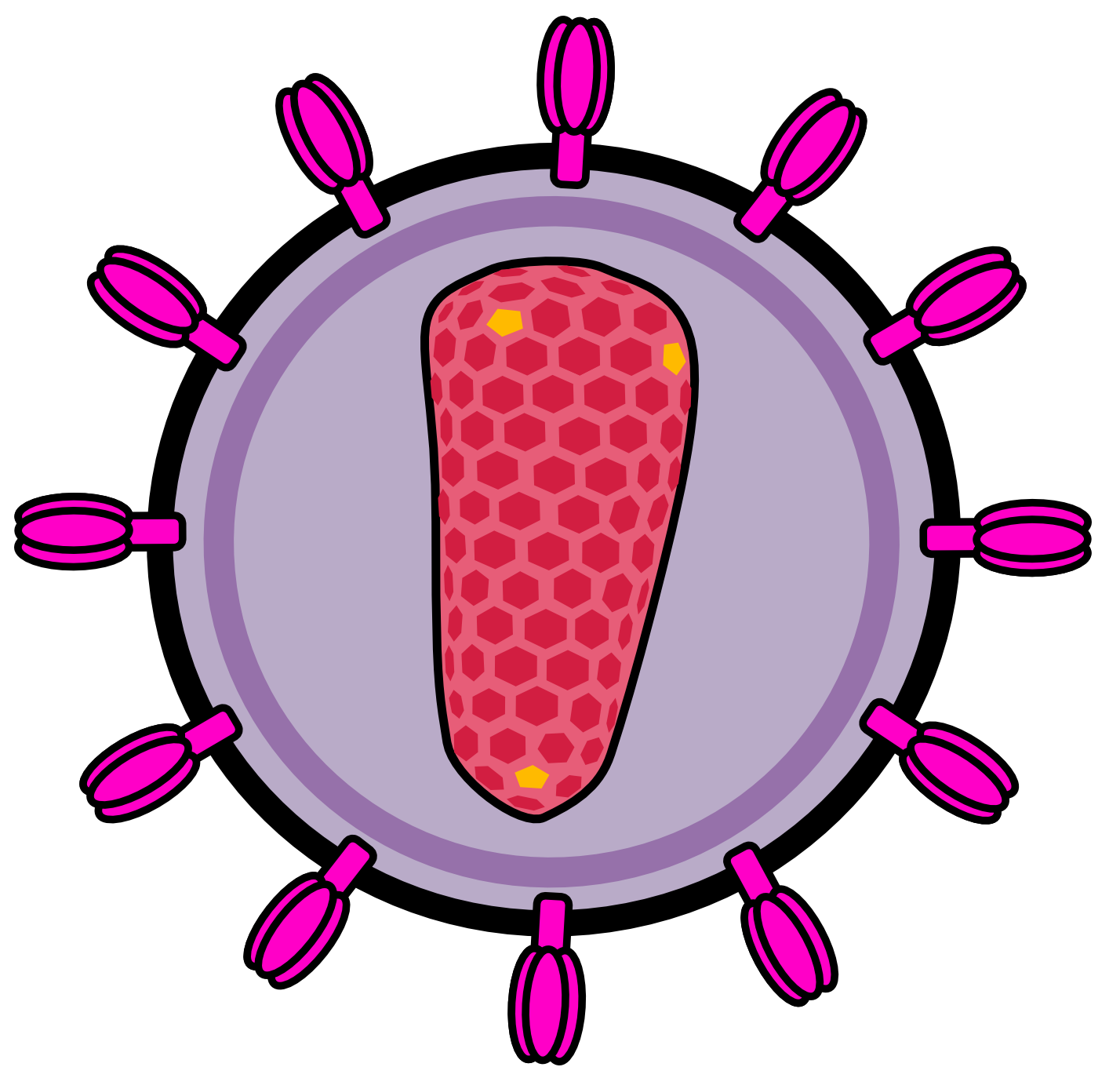 HIV viral protease cleaves the Gag polyprotein and thus produces structural proteins including the capsid protein CA (also called p24), the matrix protein MA (also called p17), the nucleocapsid protein NC (also called p7), and the p6 peptide [10]. The HIV core capsid is shaped like a truncated cone and consists of about 1500 CA monomers. Most of the CA proteins assemble into hexamers, but a few pentamers are present. The pentamers help give the core capsid its conical morphology by providing extra curvature near the top and bottom. Each core capsid contains two copies of the HIV genomic RNA, complexed with NC protein. Reverse transcriptase, integrase, and viral accessory proteins are also held within the core capsid. HIV’s core capsid is packaged into a lipid envelope that bears gp41-gp120 glycoprotein heterodimers. The MA protein forms a layer between the core capsid and the envelope.