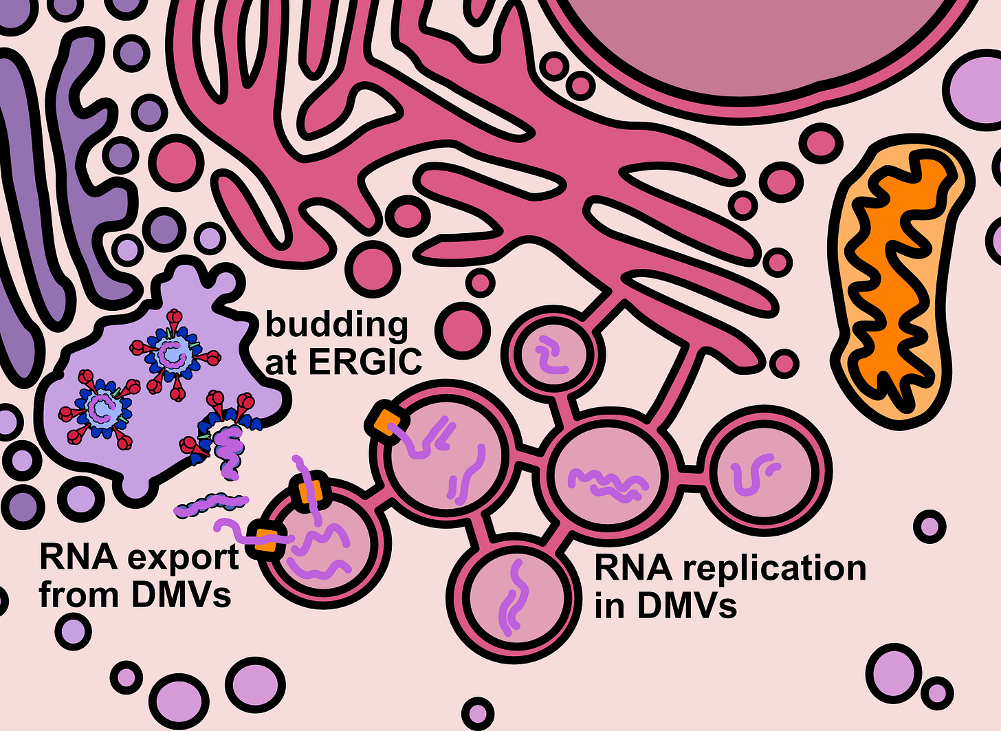 As described earlier, the nsp4, nsp6, and parts of nsp3 proteins remodel host endoplasmic reticulum (ER) to create DMVs [45]. These DMVs are the site of the coronaviral genomic replication and serve to shield the viral RNA and RdRp complex from cellular innate immune factors. DMVs cluster together and are continuous with the ER mostly through small tubular connections. After replication, the newly synthesized coronavirus RNAs undergo export into the cytosol through molecular pore complexes that span both membranes of the DMVs [47]. These molecular pore complexes are composed of nsp3 domains and possibly other viral and/or host proteins.