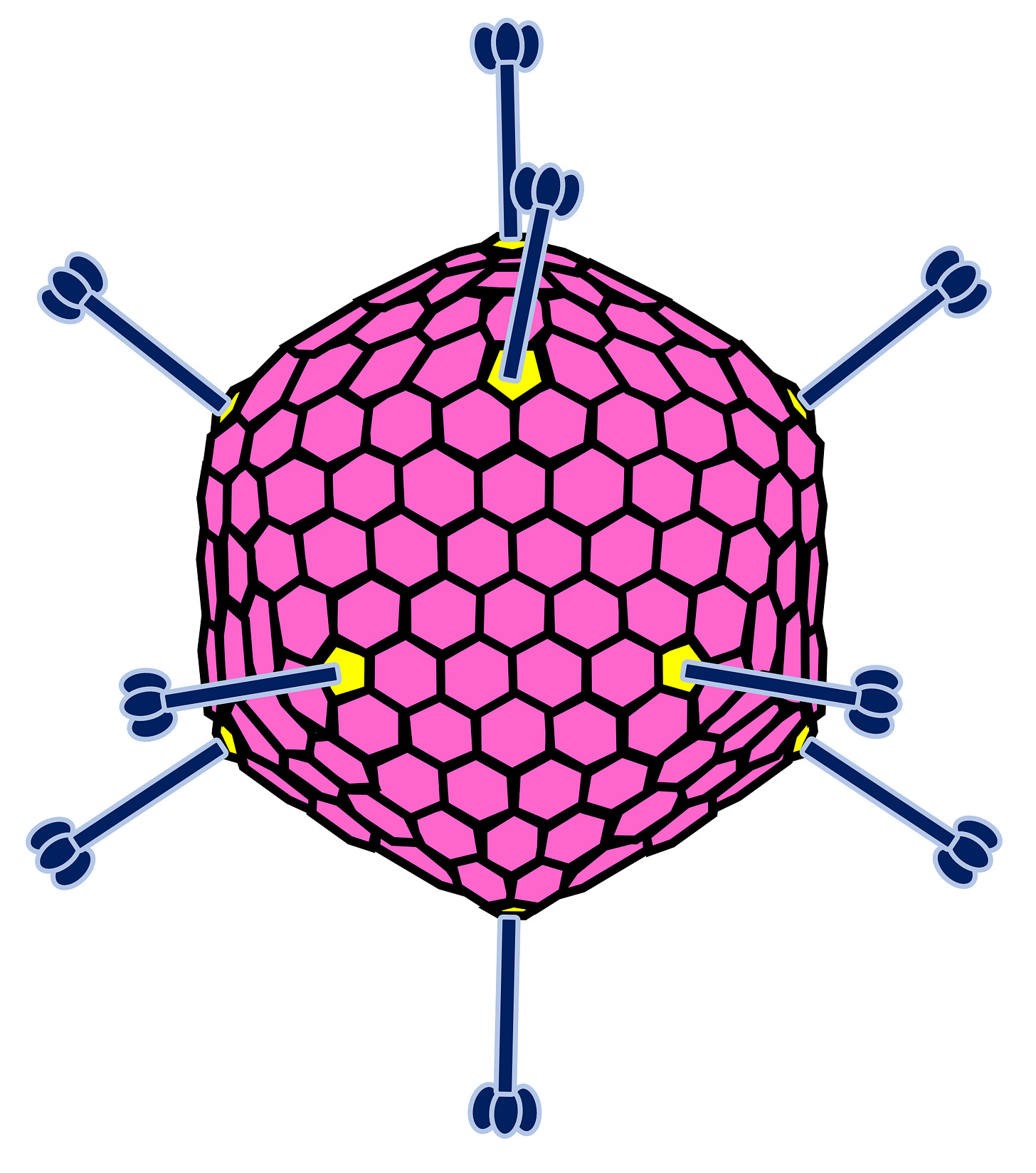 The capsid of the adenovirus is about 90 nm in diameter and consists of three major proteins (hexon, penton, and fiber proteins) as well as a variety of minor proteins and core proteins. Hexon trimer is the most abundant protein in the capsid, the pentameric pentons occur at the vertices, and trimeric fibers are positioned on top of the pentons [53]. The fibers point outwards from the capsid and end in knob domains which bind to cellular receptors. In Ad5, a commonly studied type of adenovirus, the fiber knob primarily binds to the coxsackievirus and adenovirus receptor (CAR). That said, it should be noted that Ad5’s fiber knob can also bind to alternative receptors such as vascular cell adhesion molecule 1 and heparan sulfate proteoglycans.