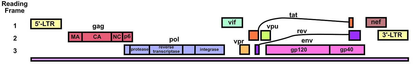 The HIV RNA genome undergoes alternative splicing to produce the rest of the viral proteins. One splicing event produces an RNA that separately encodes the Vpu protein and the Env protein (also called gp160) [6]–[8]. A mechanism called ribosome shunting is used to transition from Vpu’s open reading frame to Env’s open reading frame. The Env protein contains the gp41 and gp120 proteins. Env is post-translationally cleaved into gp41 and gp120 by a host furin enzyme in the endoplasmic reticulum [9]. It is important to note that Env is also heavily glycosylated post-translationally to help HIV evade the immune system. Several other complex splicing events lead to the production of RNAs encoding Tat, Rev, Nef, Vif, and Vpr.