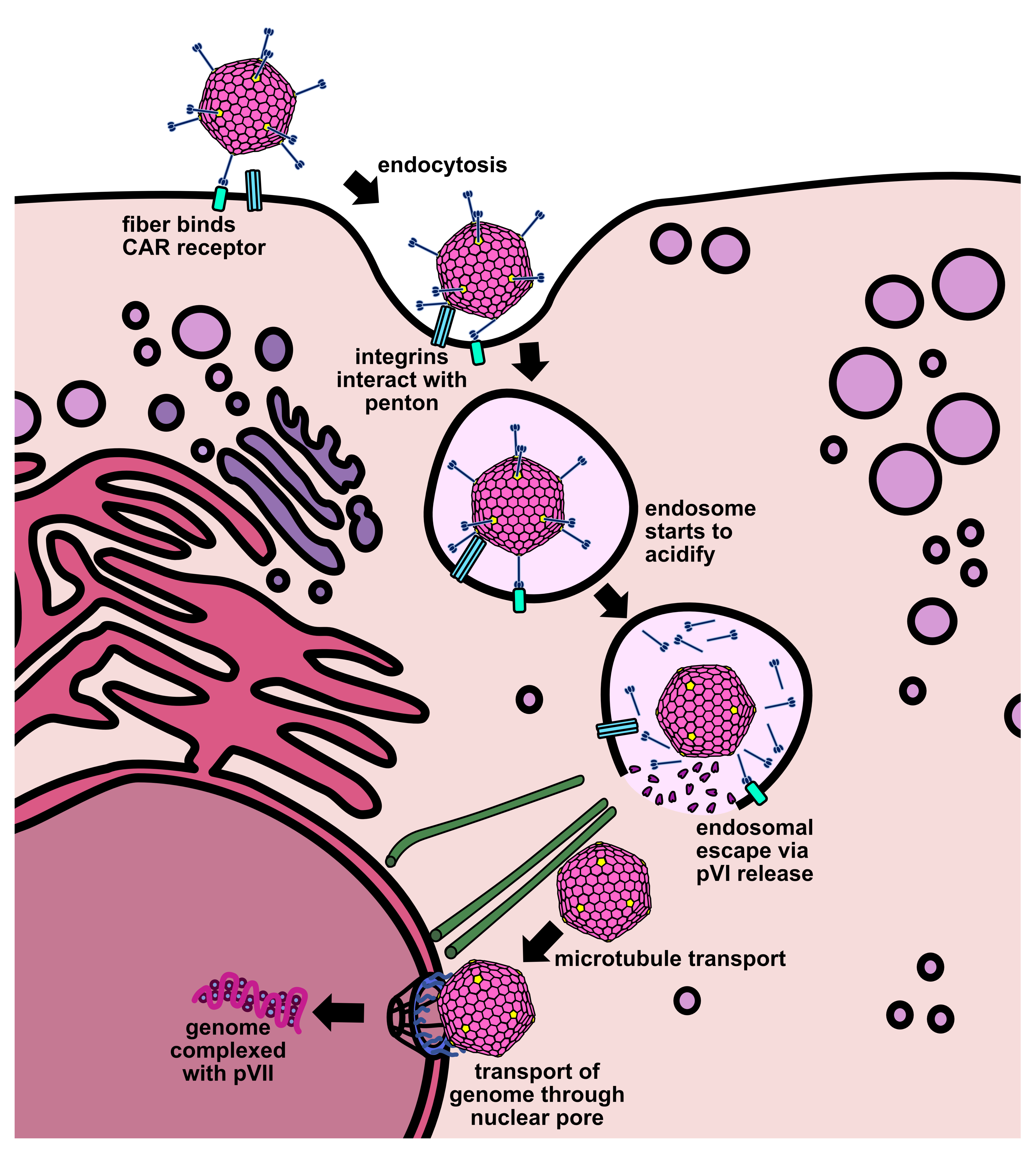 Adenovirus infects cells by binding its fiber knob to cellular receptors such as CAR (in the case of Ad5). The penton then binds certain αv integrins, positioning the viral capsid for endocytosis [56]. When the endosome acidifies, the adenovirus capsid partially disassembles, fibers and pentons fall away, and pVI is released [57]. The pVI protein’s membrane lytic activity facilitates endosomal escape. Partially disassembled capsids then undergo dynein-mediated transport along microtubules and dock at the entrance to nuclear pores. The capsids further disassemble and releases DNA through the nuclear pore. This DNA remains complexed with pVII after it enters the nucleus.